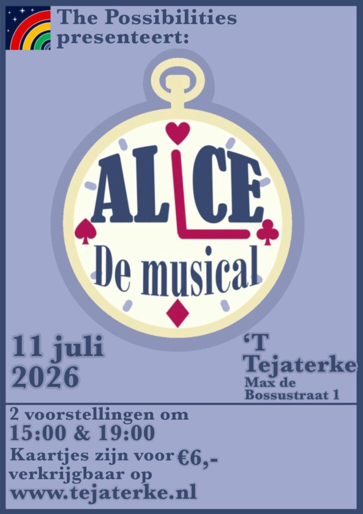 Ja hoor, het is zover! Vanaf nu is de kaartverkoop voor Alice de Musical officieel gestart. Let op, er zijn twee voorstellingen! De eerste begint op 11 Juli om 15:00, de tweede om 19:00. tickets zijn te koop op de website van het Tejaterke: https://tejaterke.nl/programma/the-possibilities-alice-de-musical/. De kaartjes zijn €6 per stuk. Ben je benieuwd wat Alice allemaal meemaakt in Wonderland? Bestel dan snel je kaarten voor de beste plaatsen, want we zien jullie natuurlijk graag in de zaal!